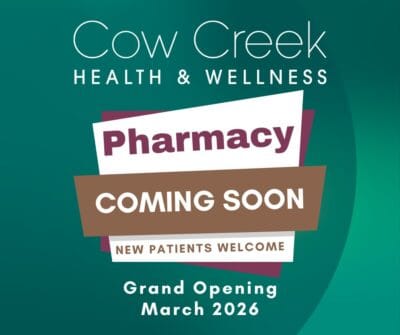 Along with Cow Creek Tribal families and employees, members of the community can have their prescriptions filled at the Cow Creek Health & Wellness Pharmacy, however they must establish care as a Cow Creek Health and Wellness Center patient first.