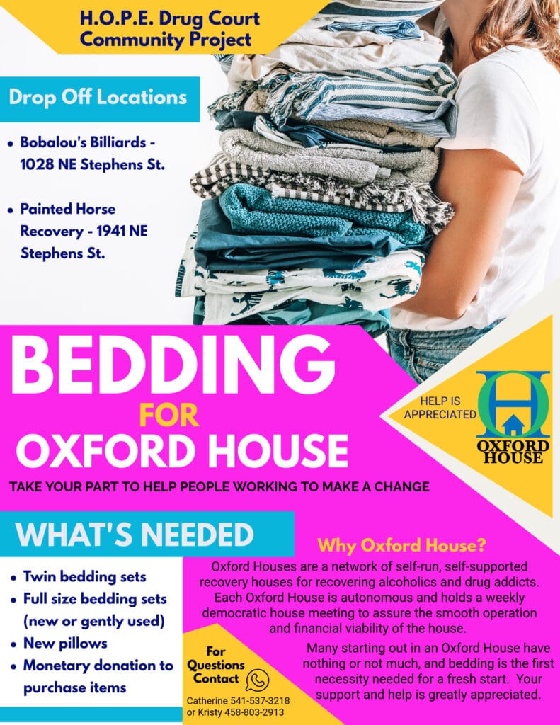 The Douglas County H.O.P.E. Drug Court program is preparing for its 109th graduation on May 13th in the Cascade Conference Hall at the fairgrounds. Graduate hopefuls Catherine Silva and Kristy Parham are seeking assistance with collecting new or gently used bedding for twin and full sizes, and new unused pillows for Oxford House.