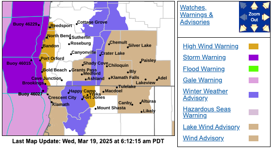 The Advisory area includes elevations above 5,000 feet in the south central and southern Oregon Cascades and Siskiyou Mountains. It applies to Howard Prairie, Lake of the Woods, the Mt. Ashland Ski Area, Crescent Lake, the Siskiyou Summit, Crater Lake and Diamond Lake as well as highways 140, 62, 138 and 230.