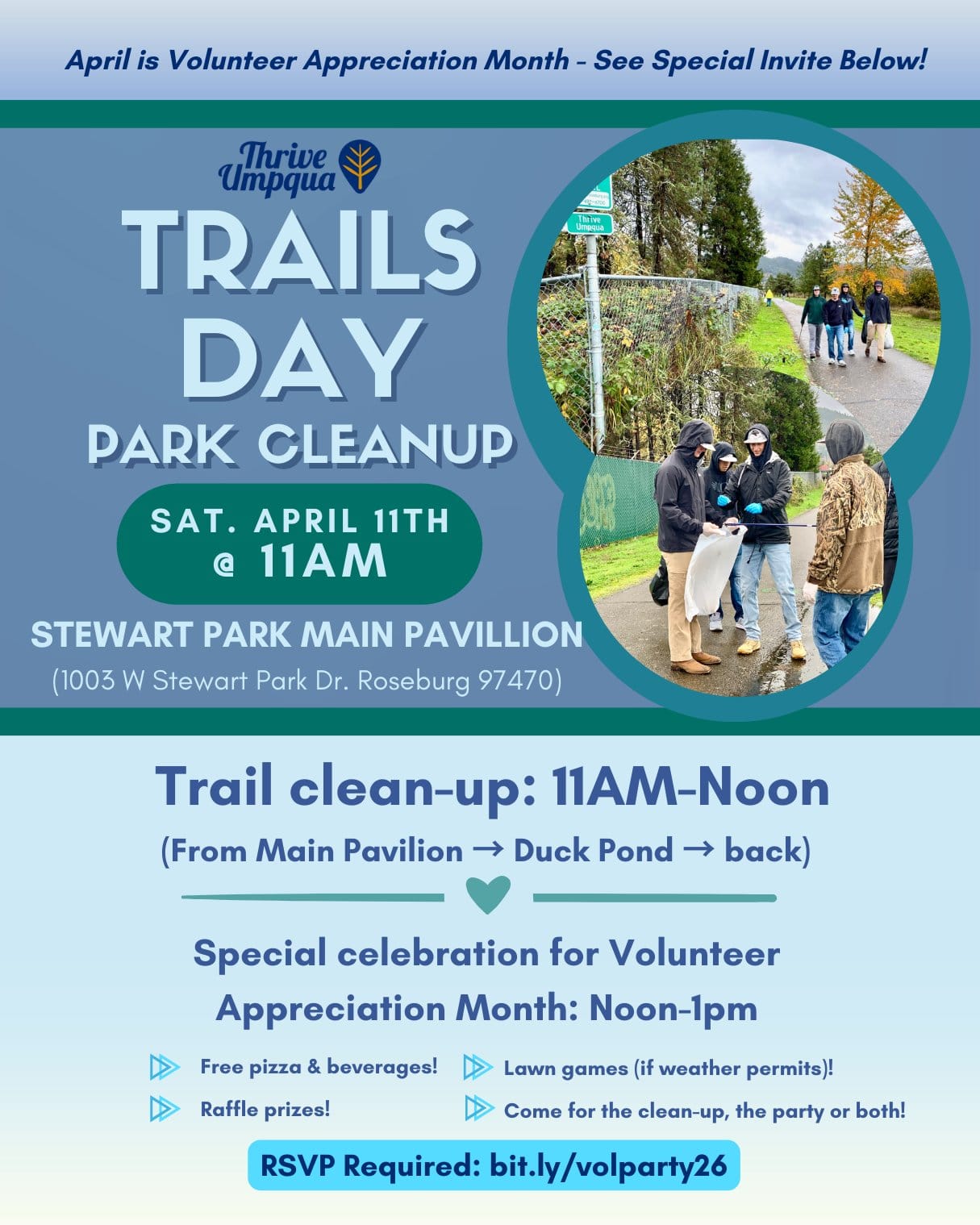 ROSEBURG, Ore. — Thrive Umpqua is inviting community members to celebrate Volunteer Appreciation Month with a community cleanup and volunteer celebration on Saturday, April 11, at Stewart Park’s Main Pavilion.