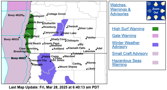 A Winter Weather Advisory remains in place through 11:00 a.m. Friday above 4,500 feet in the High Central Cascades in Douglas, Klamath and Jackson counties.