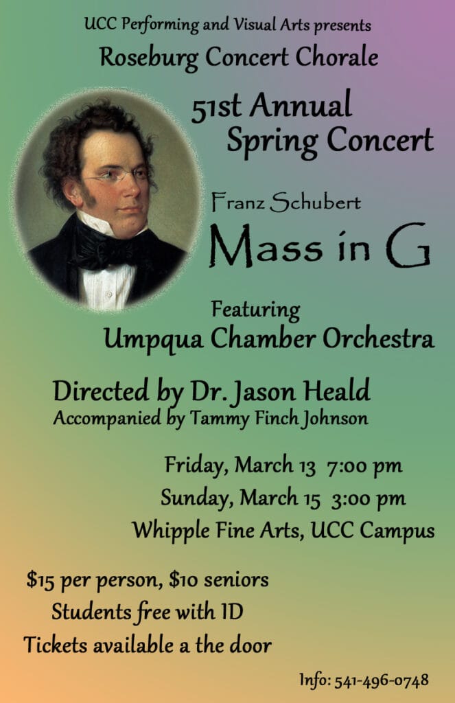Umpqua Community College Performing and Visual Arts presents the Roseburg Concert Chorale and Umpqua Chamber Orchestra in concert on Friday, March 13th at 7:00 p.m. and Sunday, March 15th at 3:00 p.m. in the Whipple Fine Arts Center on the UCC campus.