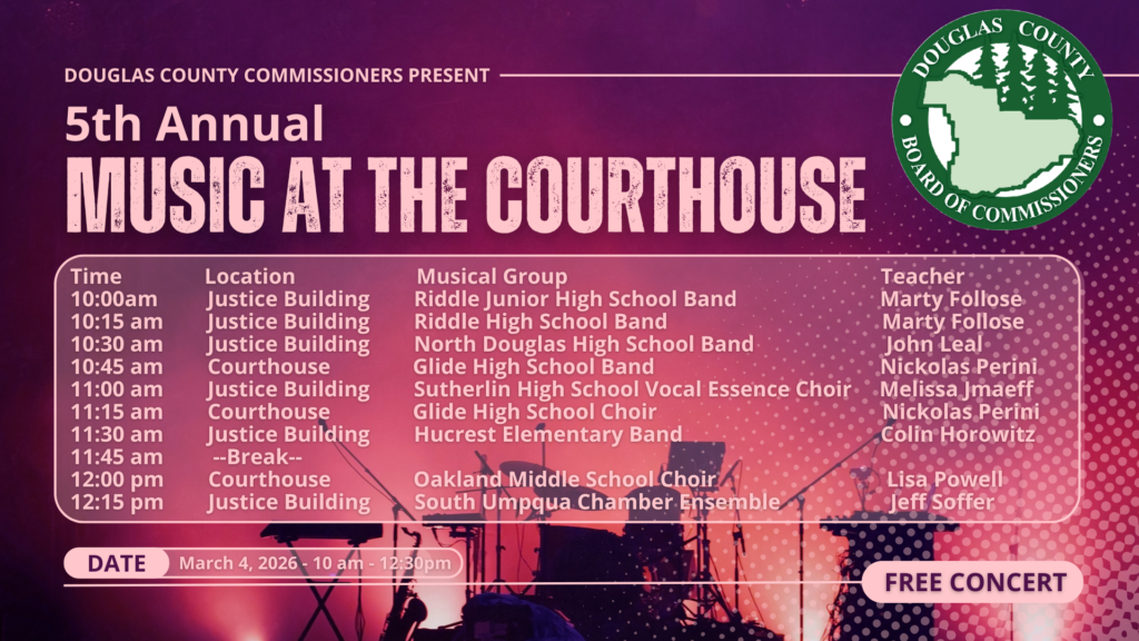 A county release said music will be presented from 10:00 a.m. to 12:30 p.m. Bands and choirs from eight Douglas County schools including Riddle, North Douglas, Glide, Sutherlin, Oakland, South Umpqua and Roseburg will perform. Music will be offered from the third-floor landing of the Justice Building with the courthouse performances on the second-floor lobby.