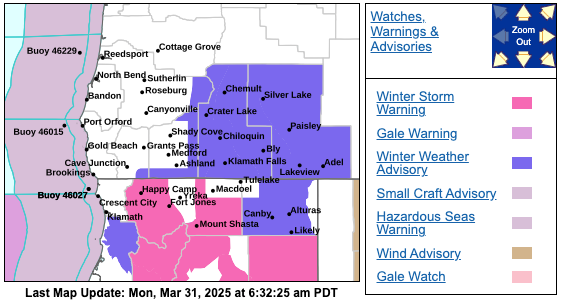 A Winter Weather Advisory remains in effect until 5:00 p.m. Tuesday for mountain areas in parts of southern Oregon.