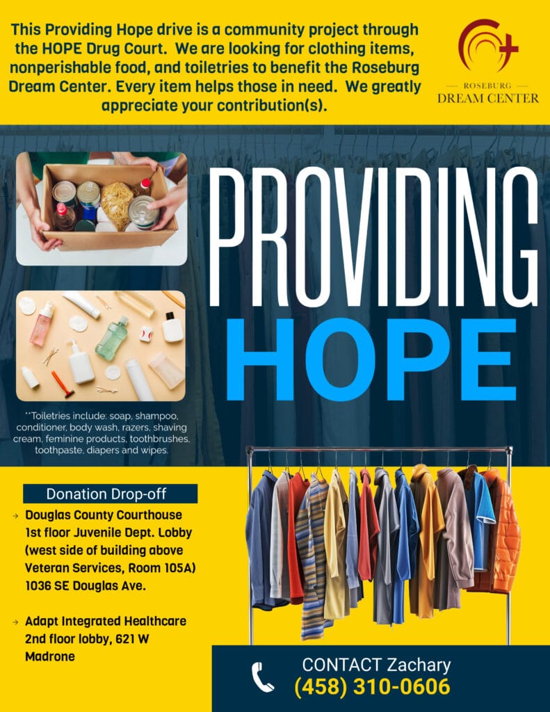 A H.O.P.E. Drug Court graduate-phase participant is seeking to collect clothing, nonperishable food and toiletries that are needed by the Roseburg Dream Center.