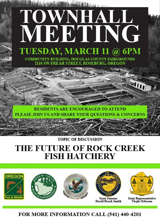 The Douglas County Board of Commissioners are encouraging residents to attend and participate in a town hall meeting regarding the future of the Rock Creek Fish Hatchery on Tuesday, March 11th at 6:00 p.m. in the Community Building of the fairgrounds.