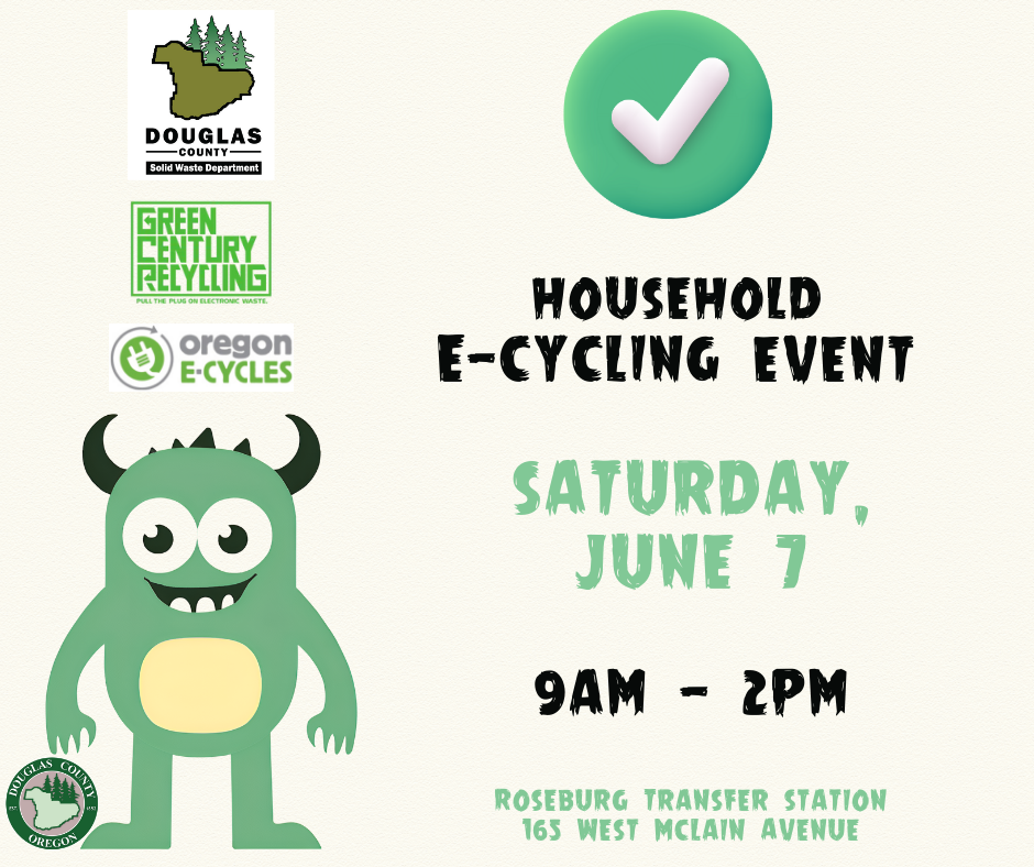 Solid Waste along with Green Century Recycling and Oregon E-Cycles are providing a free-to-the-public E-Cycling collection event on Saturday, June 7th at the Roseburg Transfer Station. It will run from 9:00 a.m. to 2:00 p.m. and is free and open to all residents and small businesses. E-cycling is the recycling of old electronics. Items that will be accepted include computers, televisions, printers, monitors, keyboards and electronic mice, gaming devices, network devices, cell phones and tablets, audio visual equipment, cords and chargers. Green Century Recycling will perform secure data destruction on data-containing devices.