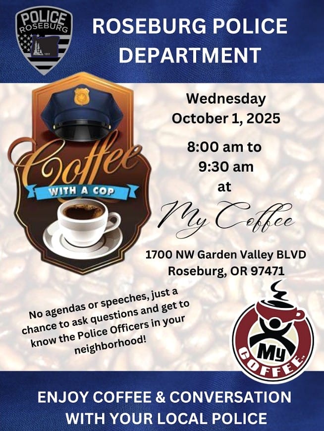 RPD will be hosting “Coffee with a Cop” from 8-9:30 a.m. at My Coffee at 1700 Northwest Garden Valley Boulevard in Roseburg.