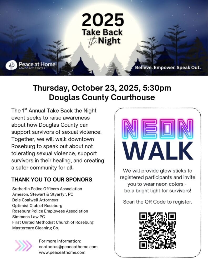 It is being held to raise awareness about how Douglas County can support survivors of sexual violence. Participants will walk through downtown Roseburg to speak out about not tolerating sexual violence, to support survivors in their healing, and to help create a safer community for all.