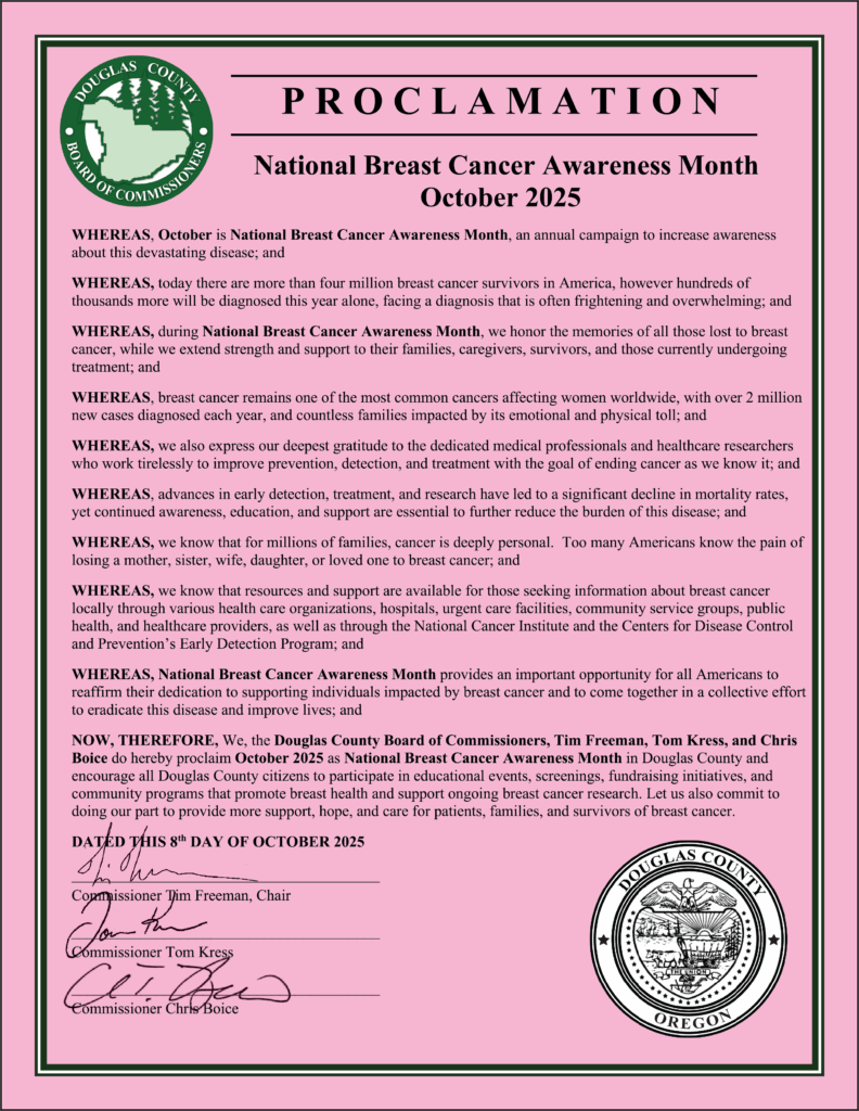 On Wednesday at their weekly business meeting, the Douglas County Board of Commissioners, Tim Freeman, Tom Kress and Chris Boice issued a proclamation calling upon all citizens of the county to observe the month of October 2025 as National Breast Cancer Awareness Month.