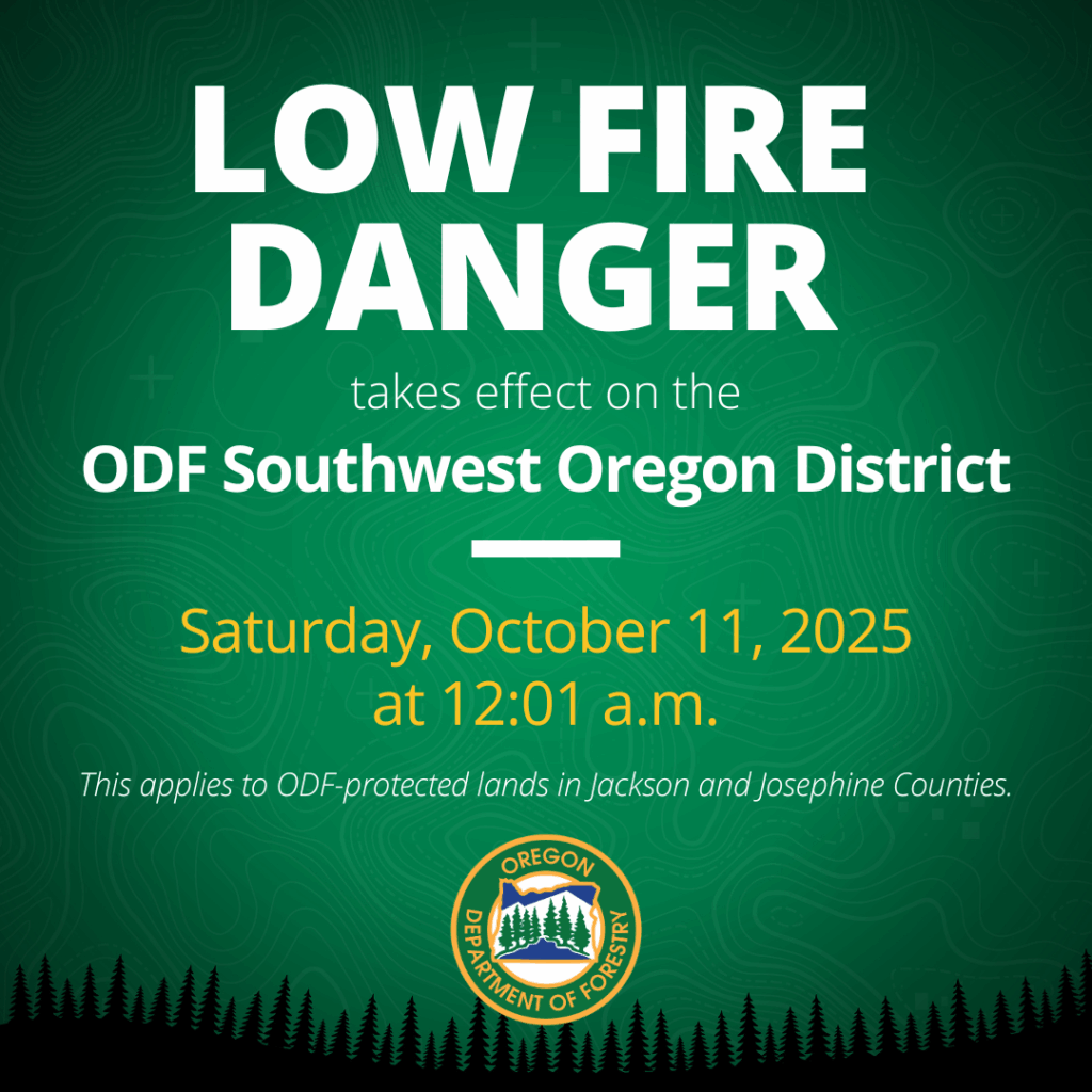 Public Information Officer Natalie Weber said effective Saturday, the public fire danger level will decrease to low on ODF-protected lands in Jackson and Josephine counties. Weber said the Industrial Fire Precaution Level will remain at IFPL1.