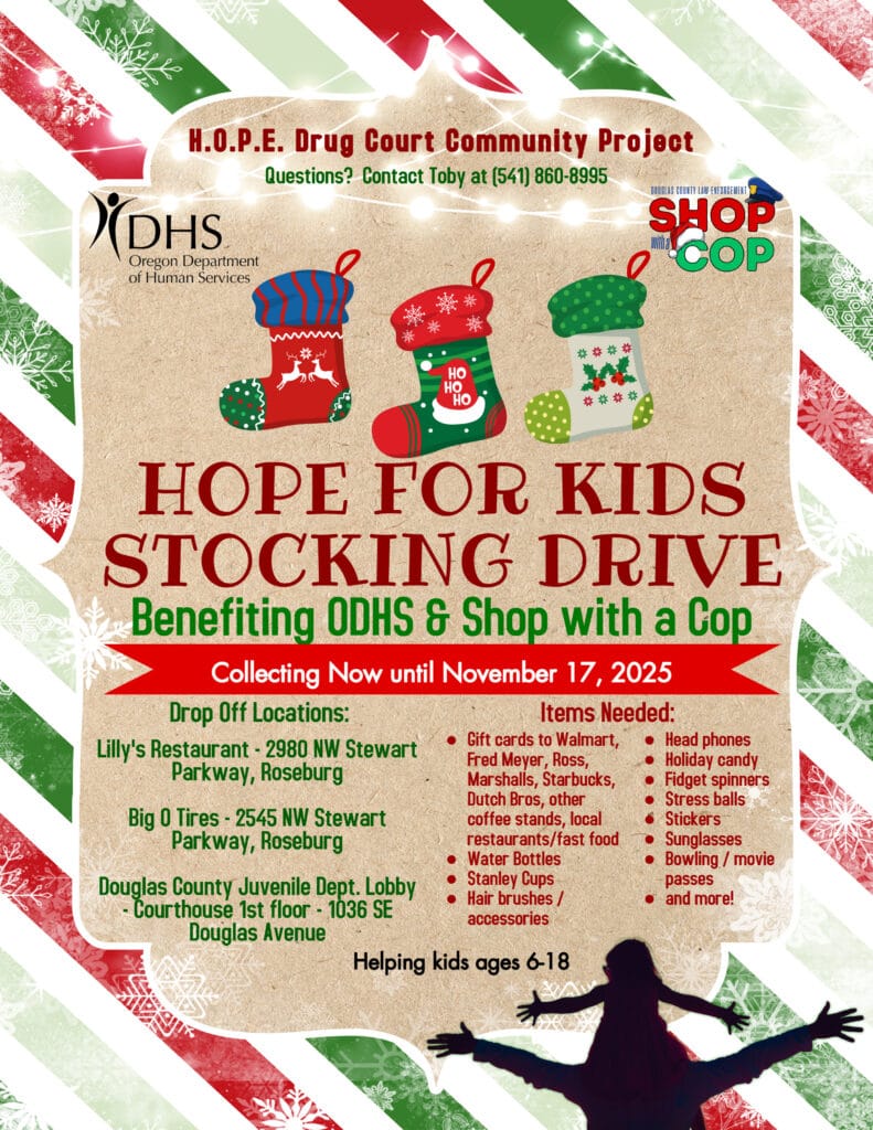 The Oregon Department of Human Services and the Shop with a Cop program are the recipients this holiday season by a H.O.P.E. Drug Court participant working to make sure teens and young children in Douglas County feel the joy of Christmas morning.