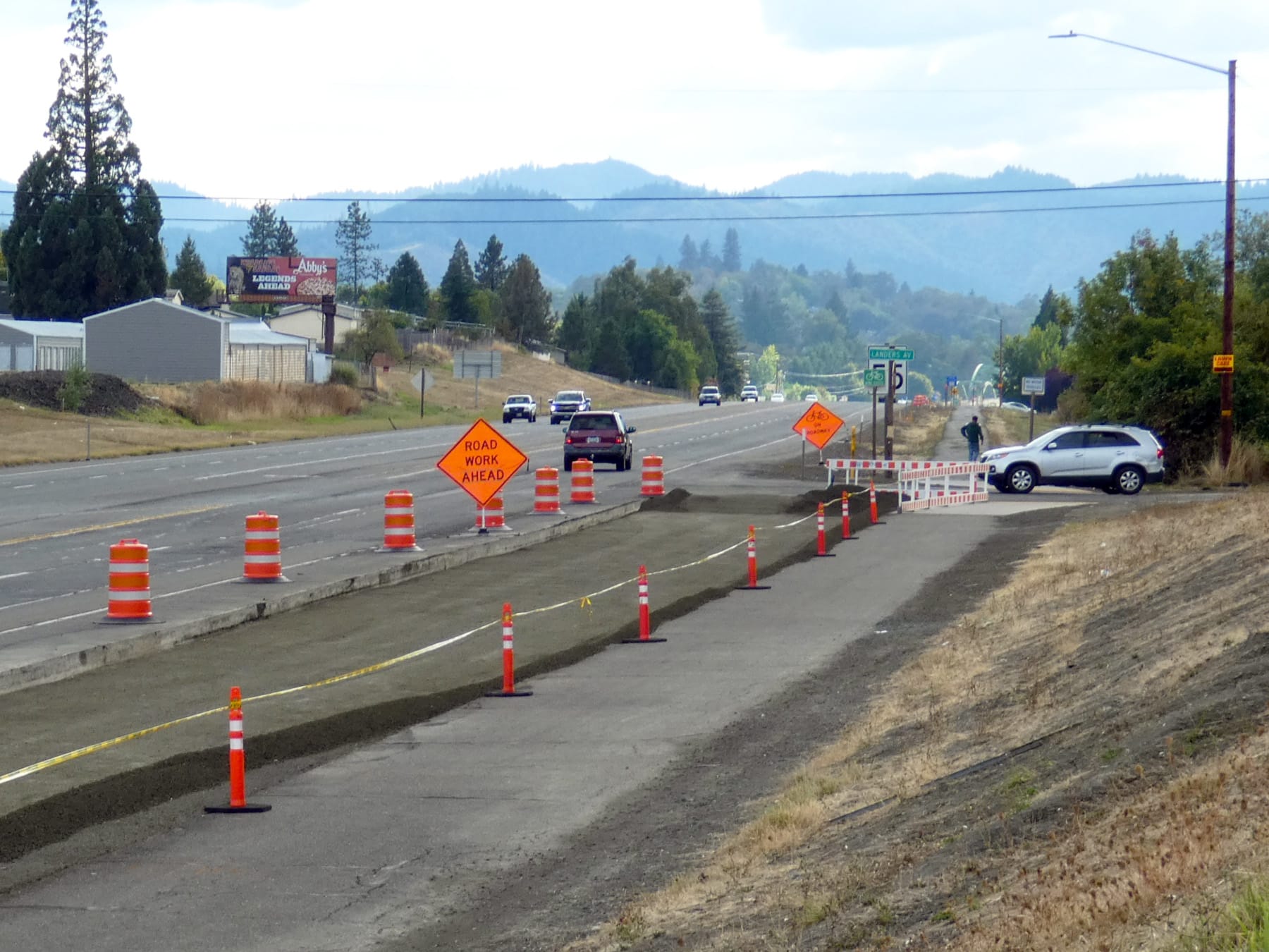 This week, prime contractor Rocky Mountain Construction is paving areas along the shoulder where Oregon Highway 42 will be widened to accommodate new turn lanes and U-turn movements. Then paving work will shift to the highway travel lanes.