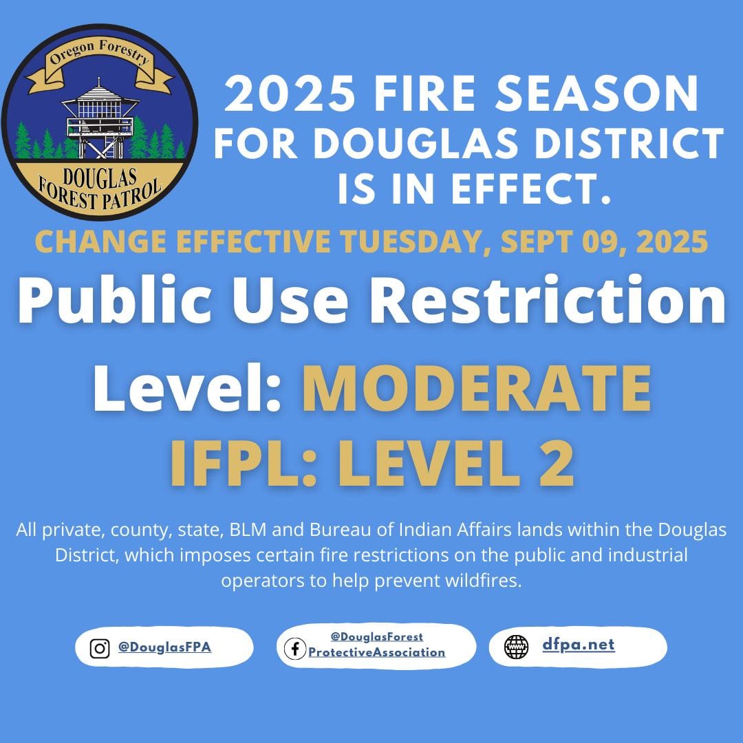 Effective Tuesday, the Douglas Forest Protective Association has decreased the Industrial Fire Precaution Levels to IFPL Level 2 on all lands protected by DFPA, which includes lands managed by the Bureau of Land Management.
