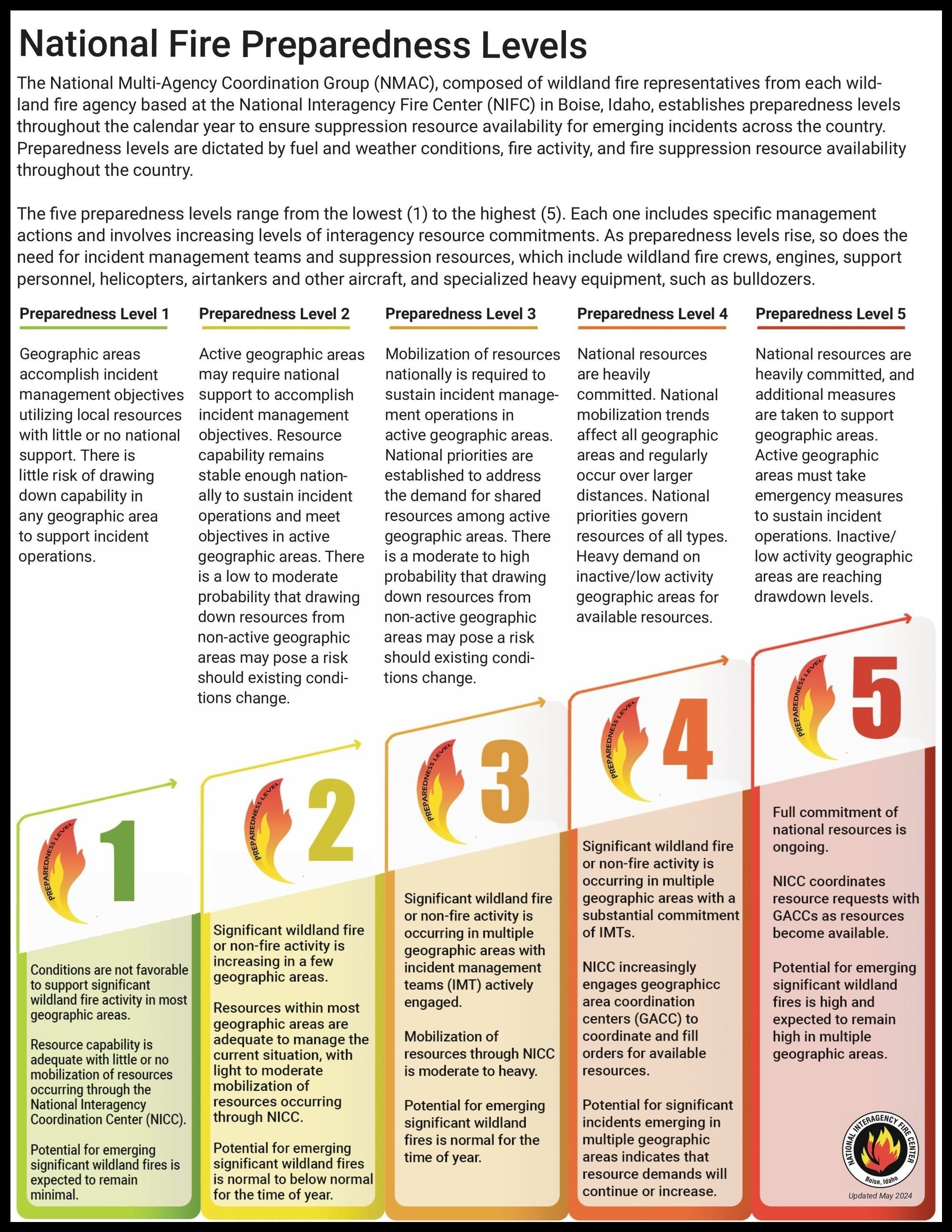 This is the second time in 2025 the National Preparedness Level increased to 2. On January 9, the level increased to 2 for about three weeks in support of the wildfires in southern California. For additional information about the National Preparedness Levels, visit the Fire Information page.