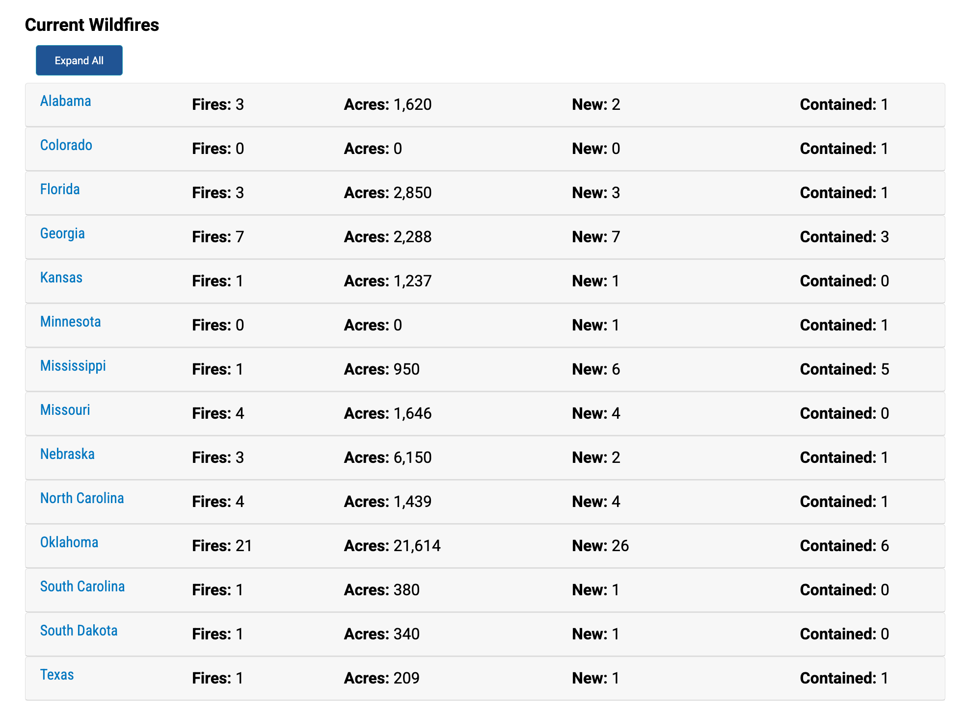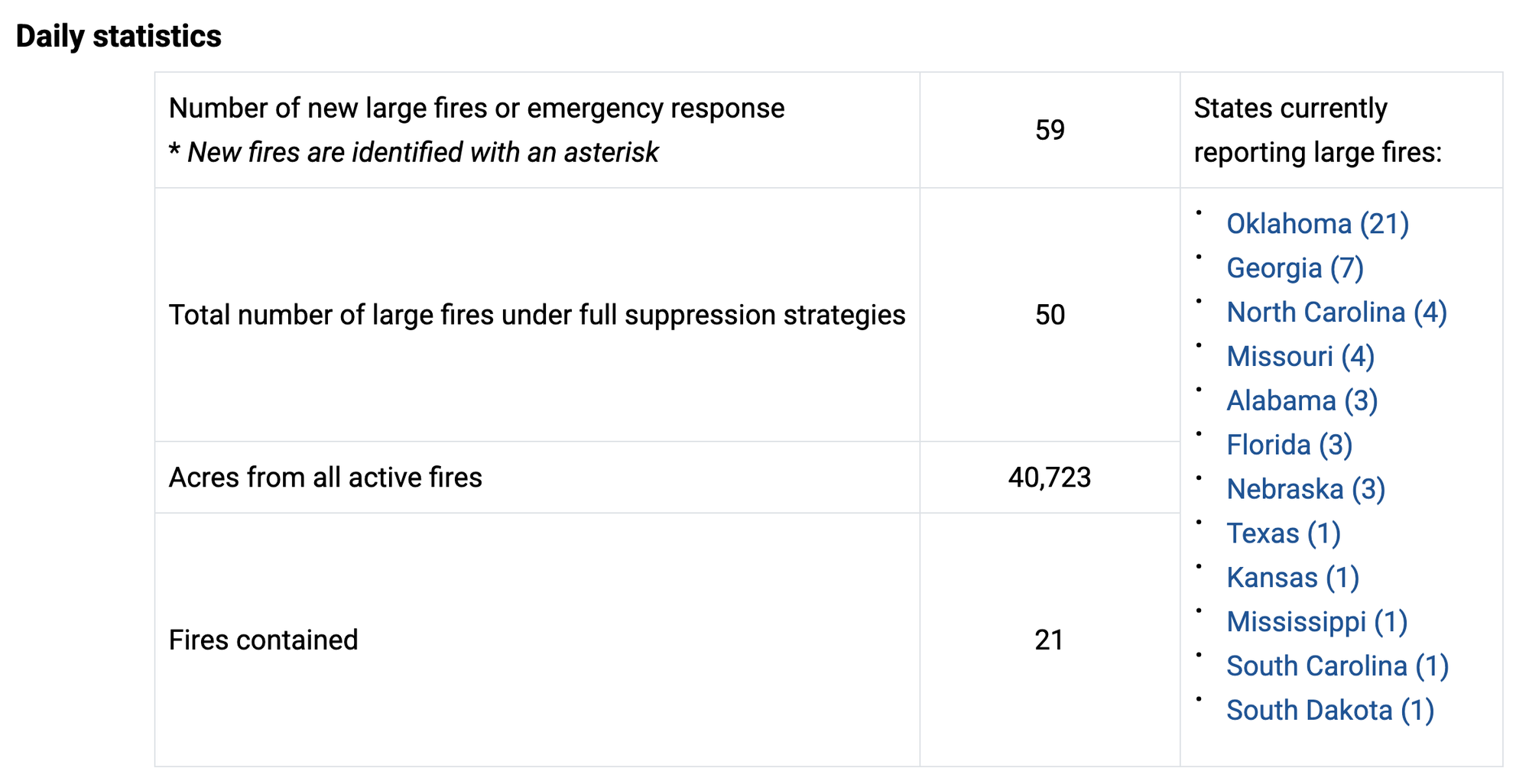 Since February 28, 59 new large fires were reported, with the majority in the Southern Area and the rest in the Rocky Mountain and Eastern Areas. 100% containment has already been achieved on 21 of these fires.