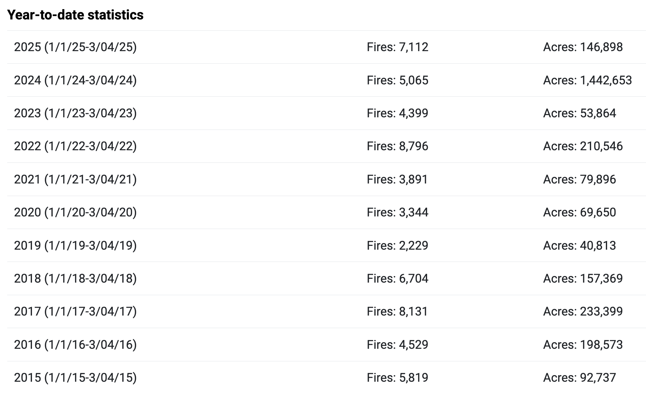 So far in 2025, 7,112 wildfires have burned 146,898 acres across the United States. This is above the 10-year average of 5,179 wildfires and below the 10-year average acreage of 252,826.