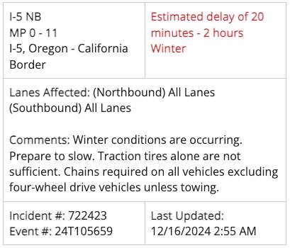 Winter conditions are occurring. Prepare to slow. Traction tires alone are not sufficient. Chains required on all vehicles excluding four-wheel drive vehicles unless towing. There is currently a delay of 20 minutes to 2 hours.