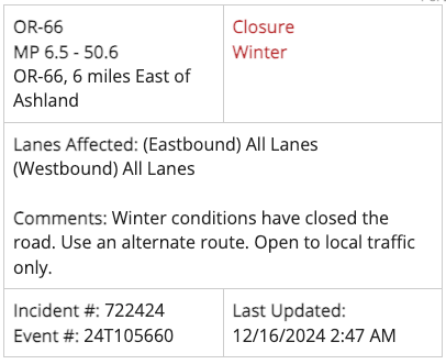 Winter conditions have closed the road. Use an alternate route. Open to local traffic only; Milepost 0 - 12.