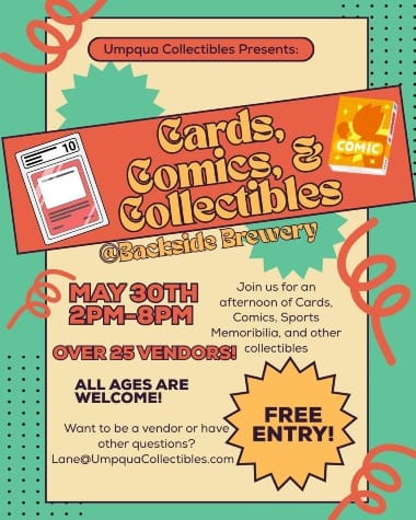 Cards, Comics & Collectibles is planned for May 30 at Backside Brewery, with organizer Lane Frost of Umpqua Collectibles describing it as part event, part community-building effort. Vendor space is still available, with Frost saying there are currently fewer than 10 spots left. Interested vendors can reach out directly, message the Umpqua Collectibles Facebook page, or fill out the vendor interest form on the organization’s website.