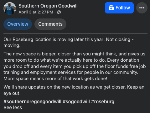ROSEBURG, Ore. — Southern Oregon Goodwill says its Roseburg store is moving later this year, with the organization emphasizing that the location is not closing but relocating to a larger space. Goodwill said the new location will be “bigger” and “closer than you might think.”
