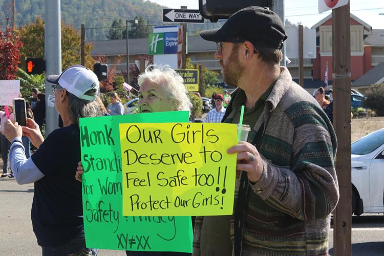 Messages on signs ranged from “No boys in girls’ locker rooms” and “Girls deserve privacy too” to “Trans rights are women’s rights” and “Protect trans kids.”