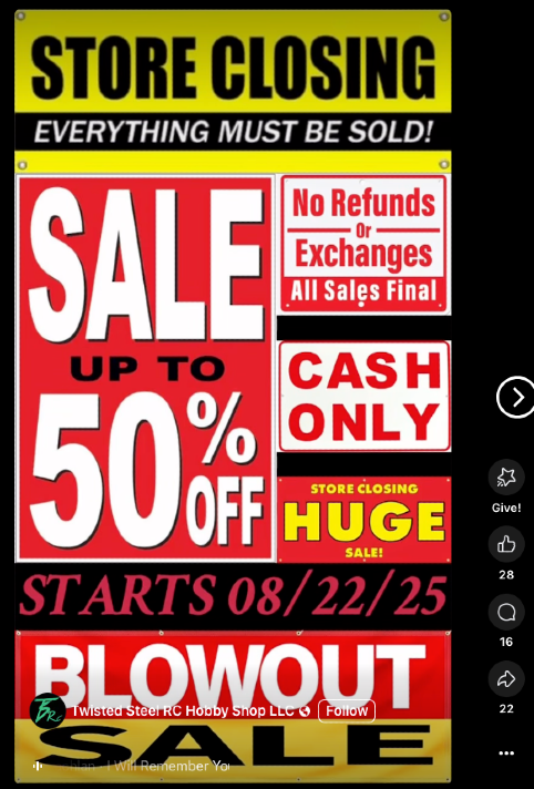 Twisted Steel RC Hobby Shop in Roseburg is closing its doors. The store confirmed it is going out of business, urging customers to use credits and warranties soon. A cash-only blowout sale with up to 50% off starts August 22, 2025. All sales final, no refunds or exchanges.