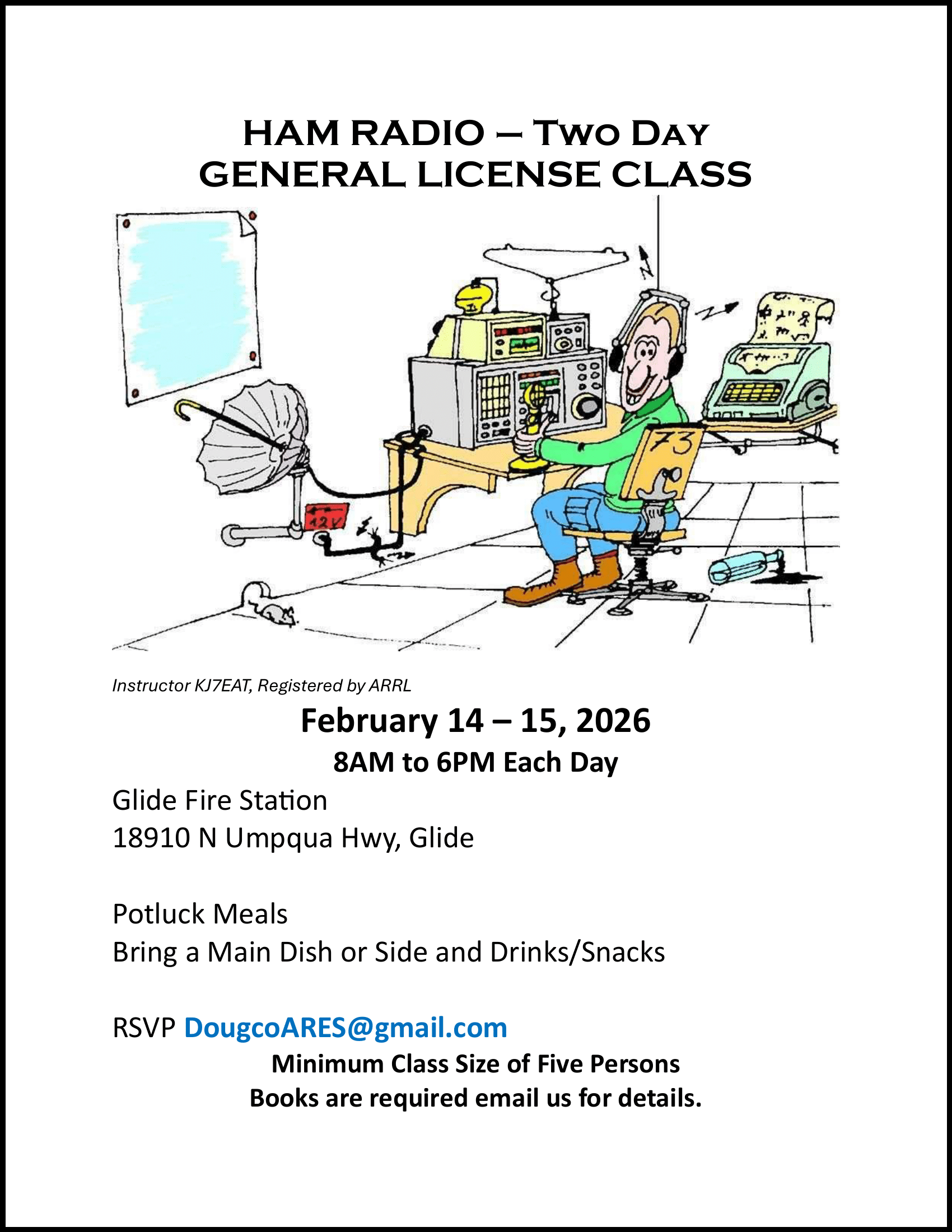 A two-day Amateur Radio General License class will be held Feb. 14–15, 2026, at the Glide Fire Station. The General license is the second FCC license level and requires a current Technician license to upgrade.