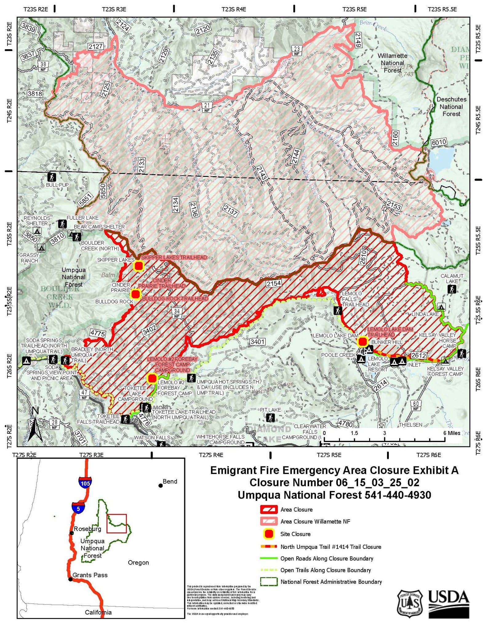The Umpqua National Forest has announced an emergency closure order for areas impacted by the Emigrant Fire, which was first reported August 24 on the neighboring Willamette National Forest. The order, issued for public and firefighter safety, is effective September 4 through November 25, 2025, unless modified or lifted sooner.