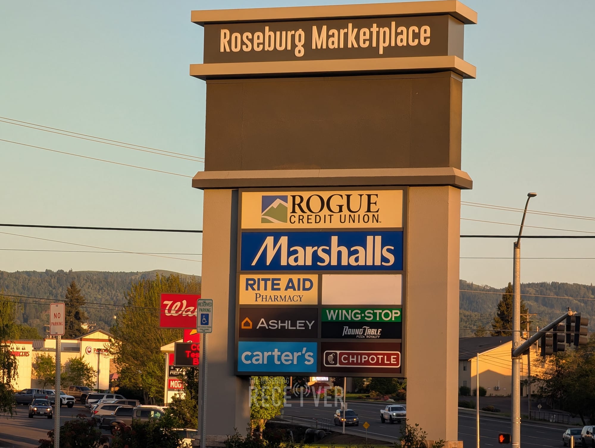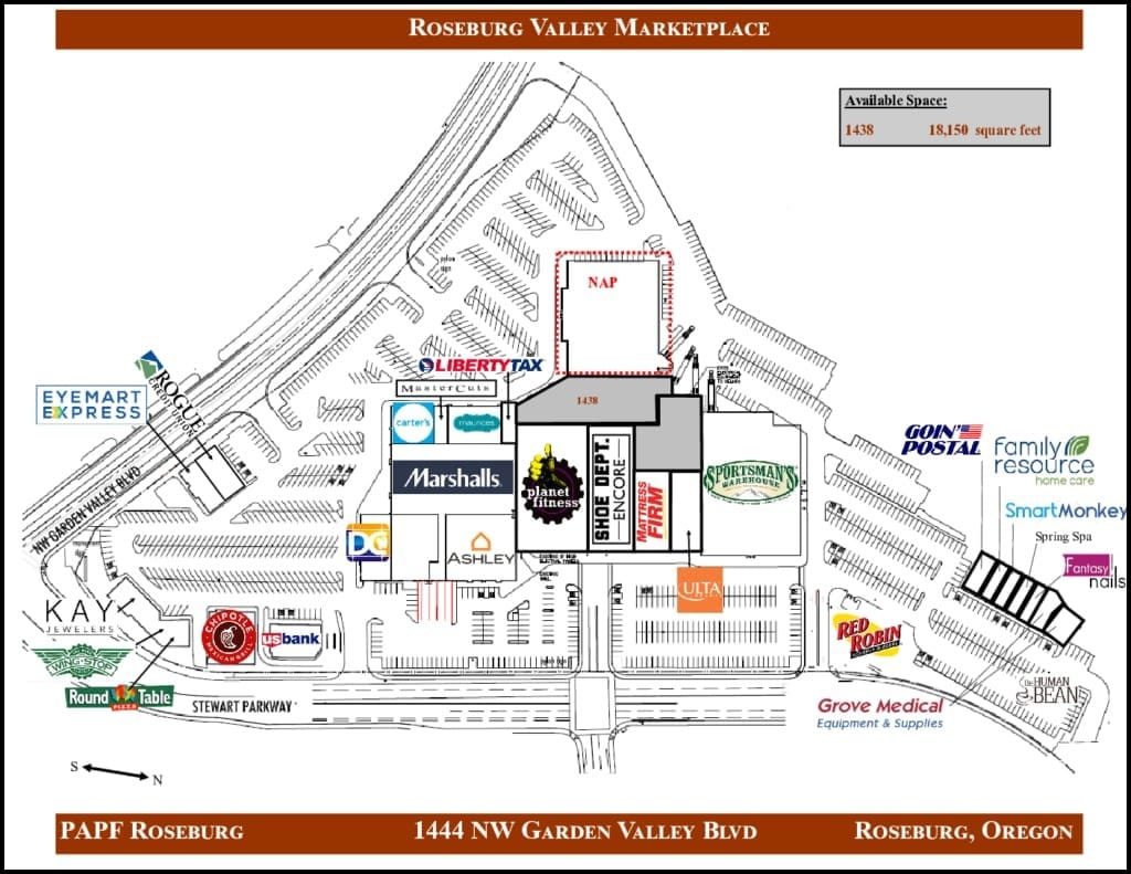 The location is also listed on Argonaut Investments’ Roseburg Marketplace property page, where “WingStop” appears among the shopping center’s anchor tenants. The page lists Roseburg Marketplace at 1438 NW Garden Valley Boulevard and identifies the center’s leasable area as 220,023 square feet.