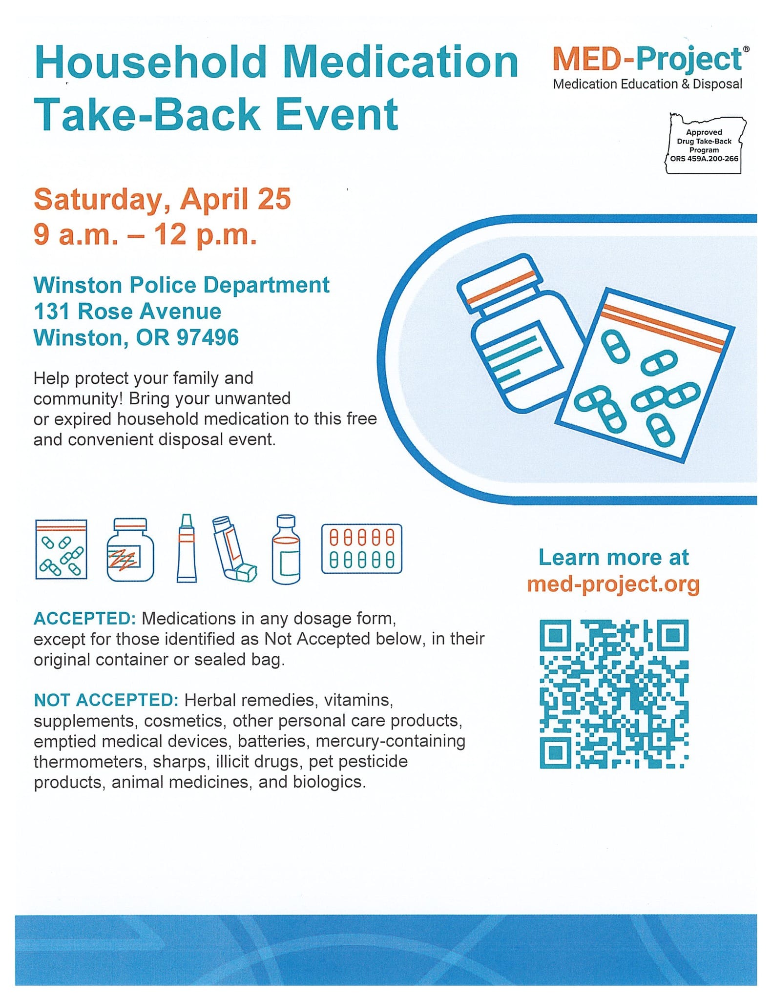 The event, hosted by the Winston Police Department with MED-Project, is scheduled for Saturday, April 25, from 9 a.m. to noon at 131 Rose Avenue in Winston. The collection is free and open to all Oregon residents.